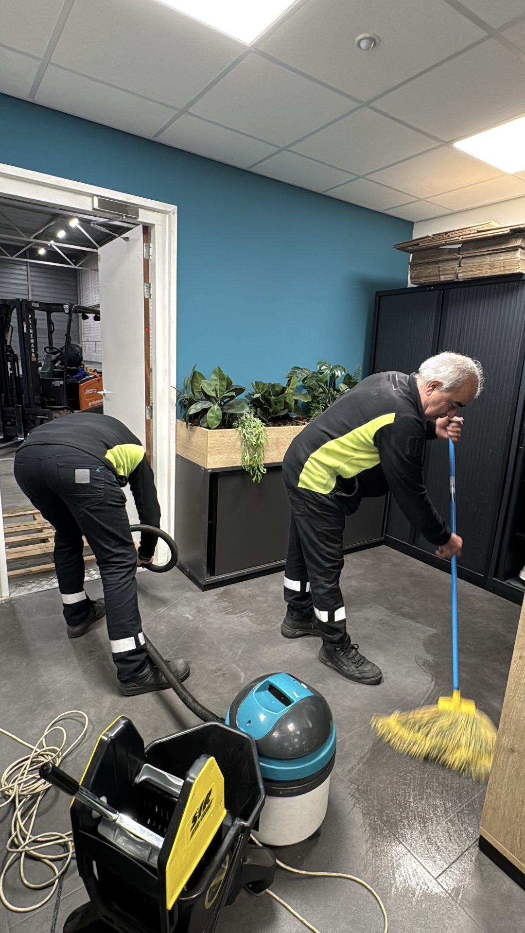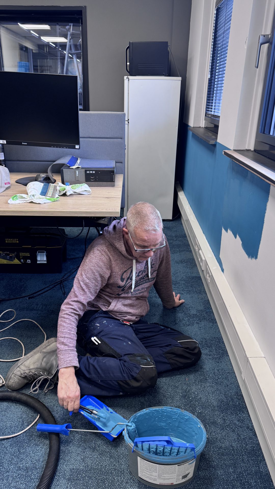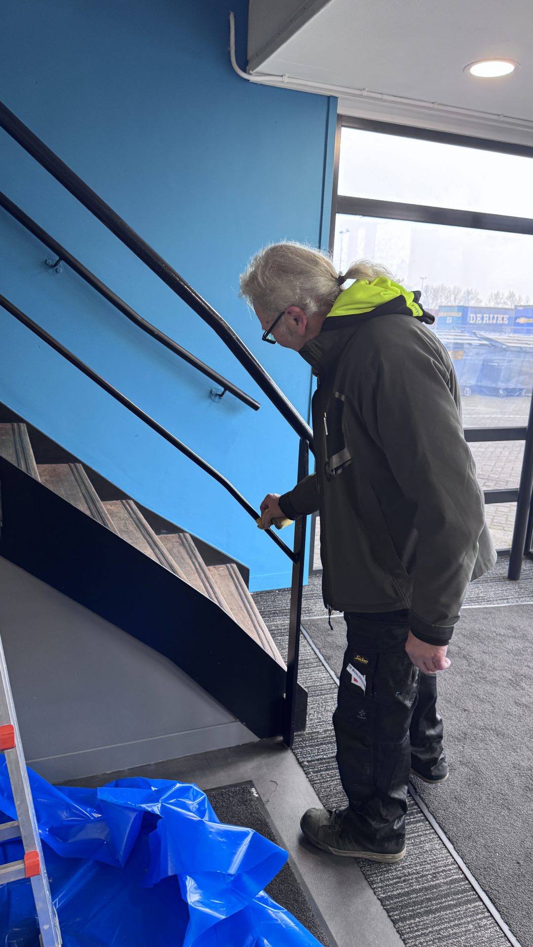 De mannen zijn de puntjes op de i aan het zetten voor wat betreft het verven van de diverse wanden. Henk is het loodskantoor nog even netjes aan het maken, Derk zeg maar Dirk, maakt de trap schoon en Leen en Reza zijn aan het stofzuigen en dweilen. Deze mannen zijn multi functioneel inzetbaar, schoonmaken kunnen ze dus ook. Ook zijn er stickers geleverd en daarvan is er al 1 opgeplakt.