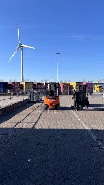 Nog voordat het hek openging om 07:30 stond daar al de eerste chauffeur te trappelen om zijn lading af te leveren. In de loop van de dag zijn er een paar zendingen afgeleverd en is de eerste zending ook al opgehaald. De mannen hadden de tijd om de vorkheftrucks nog even af te spoelen en in het zonnetje te laten drogen.